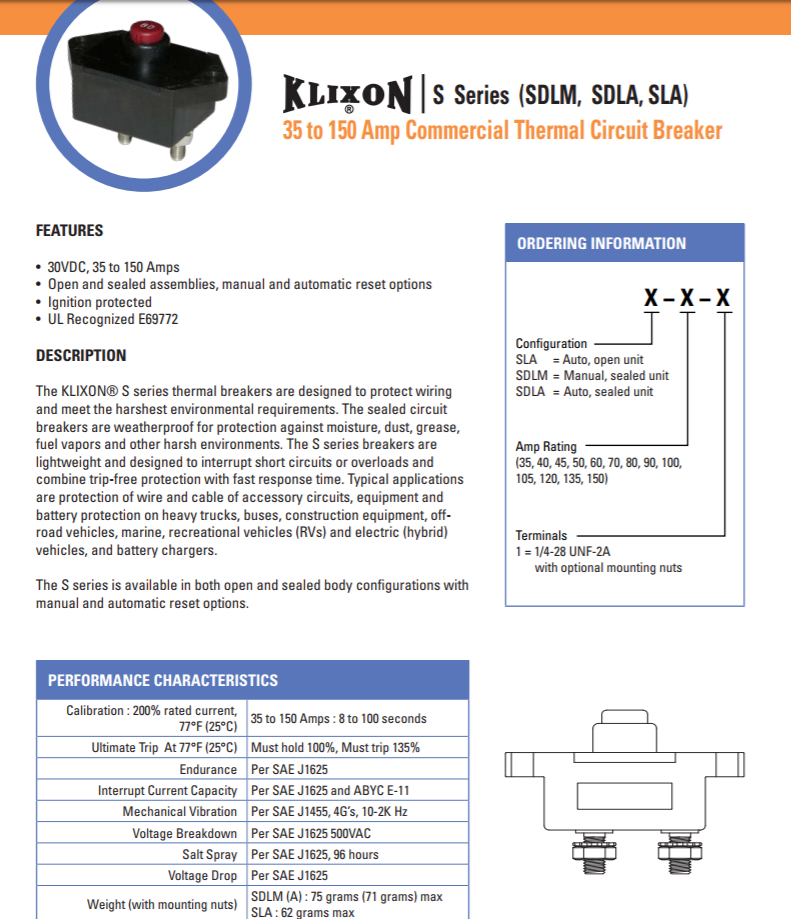 KLIXON@S系列熱斷路器旨在保護(hù)接線,并滿足最苛刻的環(huán)境要求。密封斷路器具有防風(fēng)雨功能,可防止潮濕、灰塵、油脂、燃油蒸汽和其他惡劣環(huán)境。S系列斷路器重量輕,設(shè)計(jì)用于中斷短路或過載,并結(jié)合無跳閘保護(hù)和快速響應(yīng)時(shí)間。典型應(yīng)用包括重型卡車、公共汽車、建筑設(shè)備、越野車、海上、休閑車(RVs)和電動(混合動力)車輛上的附件電路、設(shè)備和電池保護(hù)的電線和電纜保護(hù),以及電池充電器。S系列有開放式和密封式車身配置,帶有手動和自動復(fù)位選項(xiàng)。