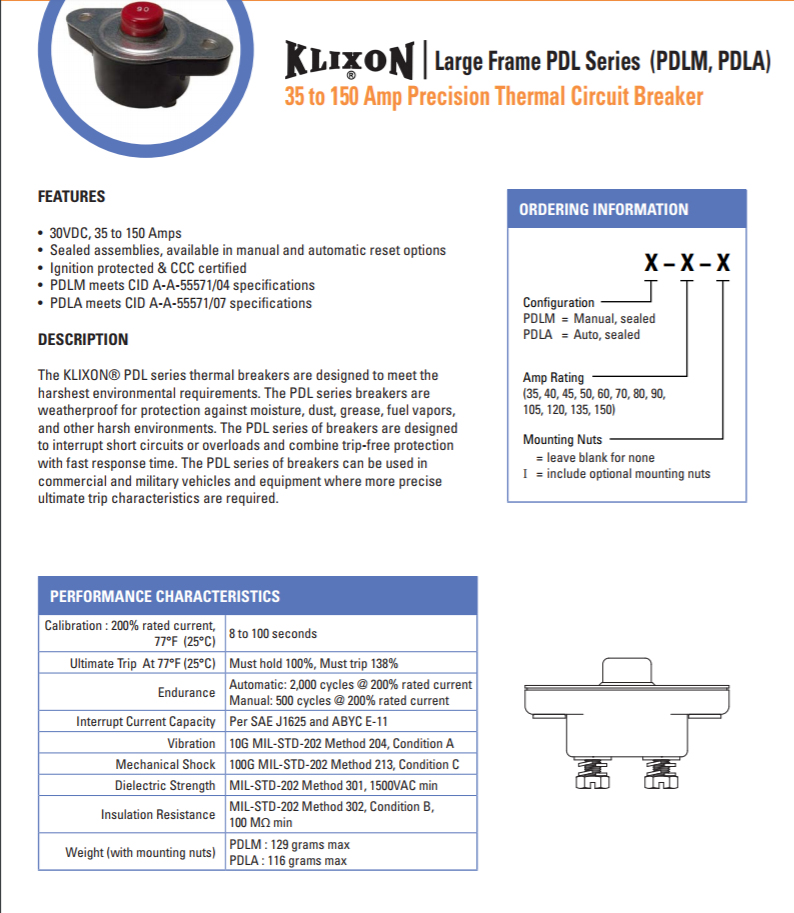 KLIXON@PD系列熱斷路器旨在保護接線,并滿足最苛刻的環(huán)境要求。PD系列是防風雨密封的,用于防潮、防塵、防油脂、防燃油蒸汽和其他惡劣環(huán)境。PD系列斷路器結構緊湊、重量輕,設計用于中斷短路或過載,并將無跳閘保護與快速響應時間相結合。典型應用包括對附件電路的電線和電纜的保護、建筑和越野設備、船舶、休閑車(RV)、采礦、農業(yè)設備和電動(混合動力)車輛中的設備和電池保護。PD系列用于商業(yè)和軍事應用。