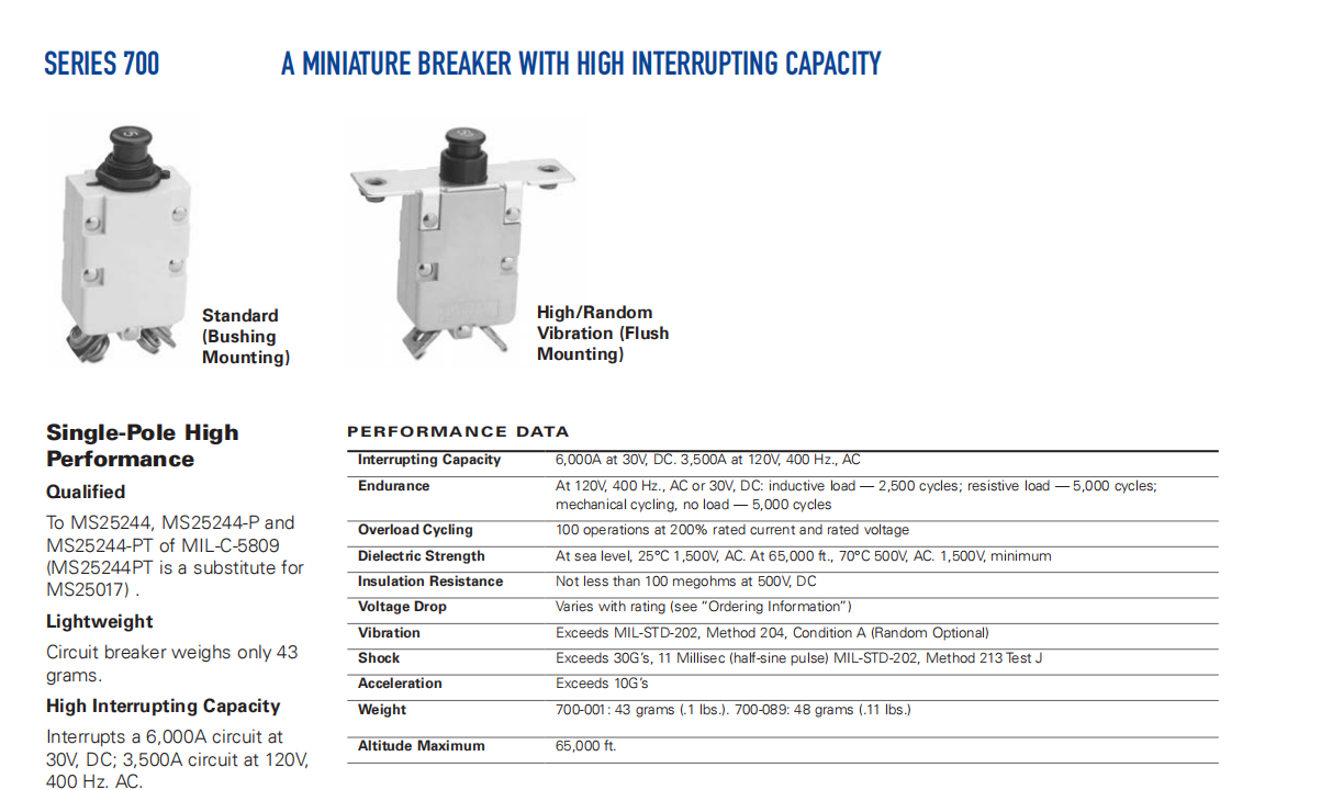 超過軍用規(guī)格耐久性要求,振動、機械沖擊、,和加速度。700是微型推挽斷路器提供快速跳閘和高中斷能力。免費旅行
