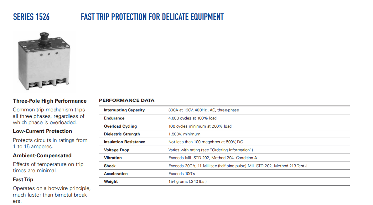 1526系列是唯一熱門的電線,快速跳閘,三極電路斷路器額定值1-15安培。單個(gè)執(zhí)行器控制所有三極,因此