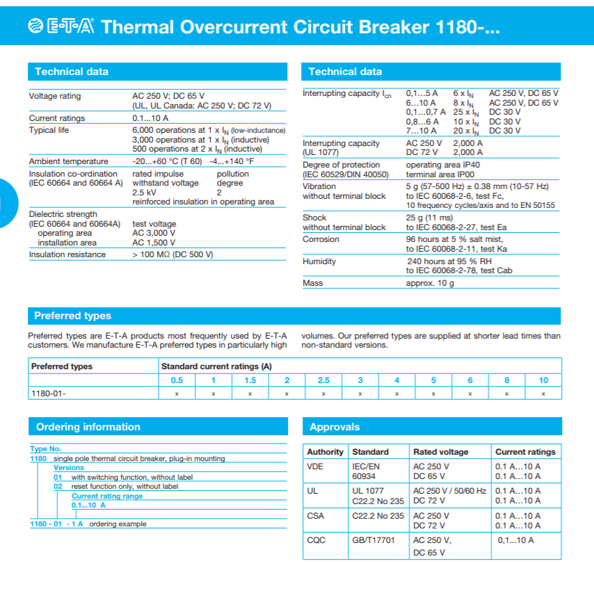 1180系列:迷你型單極熱式斷路器,帶切換功能可選(推-推式操作方式)??煽康淖杂擅摽?,定點(diǎn)飛入機(jī)械結(jié)構(gòu)。產(chǎn)品符合設(shè)備用斷路器標(biāo)準(zhǔn) EN/IEC 60934,S-型,TO。插片式接線端子,適用導(dǎo)軌安裝的底座。