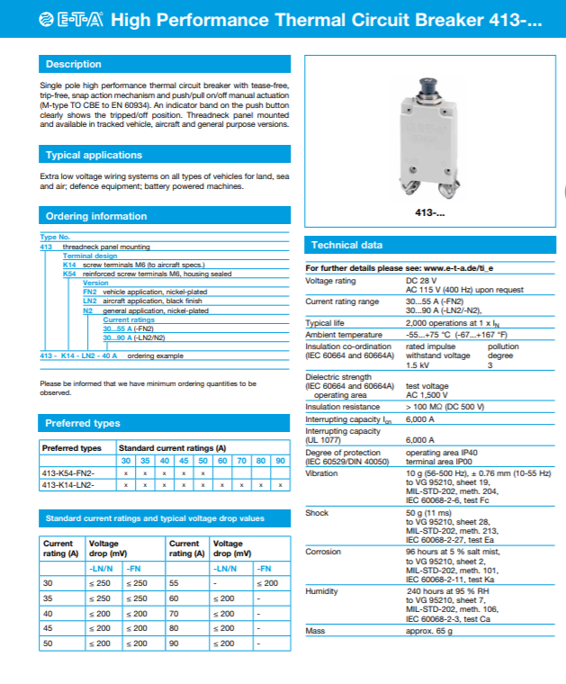 413系列:?jiǎn)螛O高性能熱式斷路器,自由脫扣,定點(diǎn)飛入/快速動(dòng)作機(jī)械機(jī)構(gòu),推(ON)/拔(OFF)式操作方