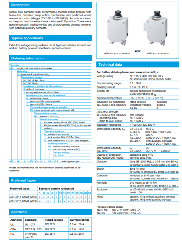 482系列:單極緊湊型高性能熱式斷路器,自由脫扣,定點(diǎn)飛入/快速動(dòng)作機(jī)械結(jié)構(gòu),推(ON)/拔(OFF)式操作(M-型TO設(shè)備用斷路器,參照EN60934)。按鈕底部的白色指示環(huán)可以清晰的顯示脫扣/OFF狀態(tài)。頸項(xiàng)面板安裝,適用于履帶式車輛,航空器/通用應(yīng)用,輔助觸點(diǎn)可選。