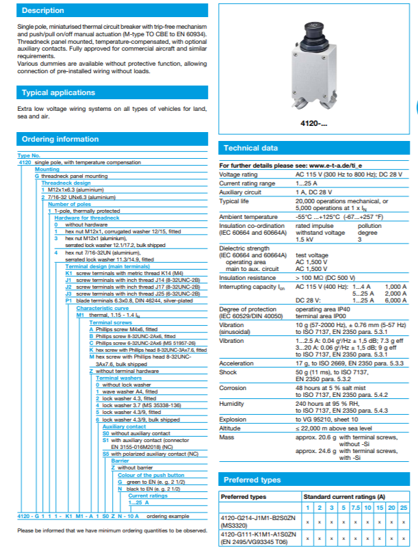 4120系列:單極,迷你型熱式斷路器,自由脫扣,推(ON)/拔(OFF)式操作方式(M-型TO設(shè)備用斷路